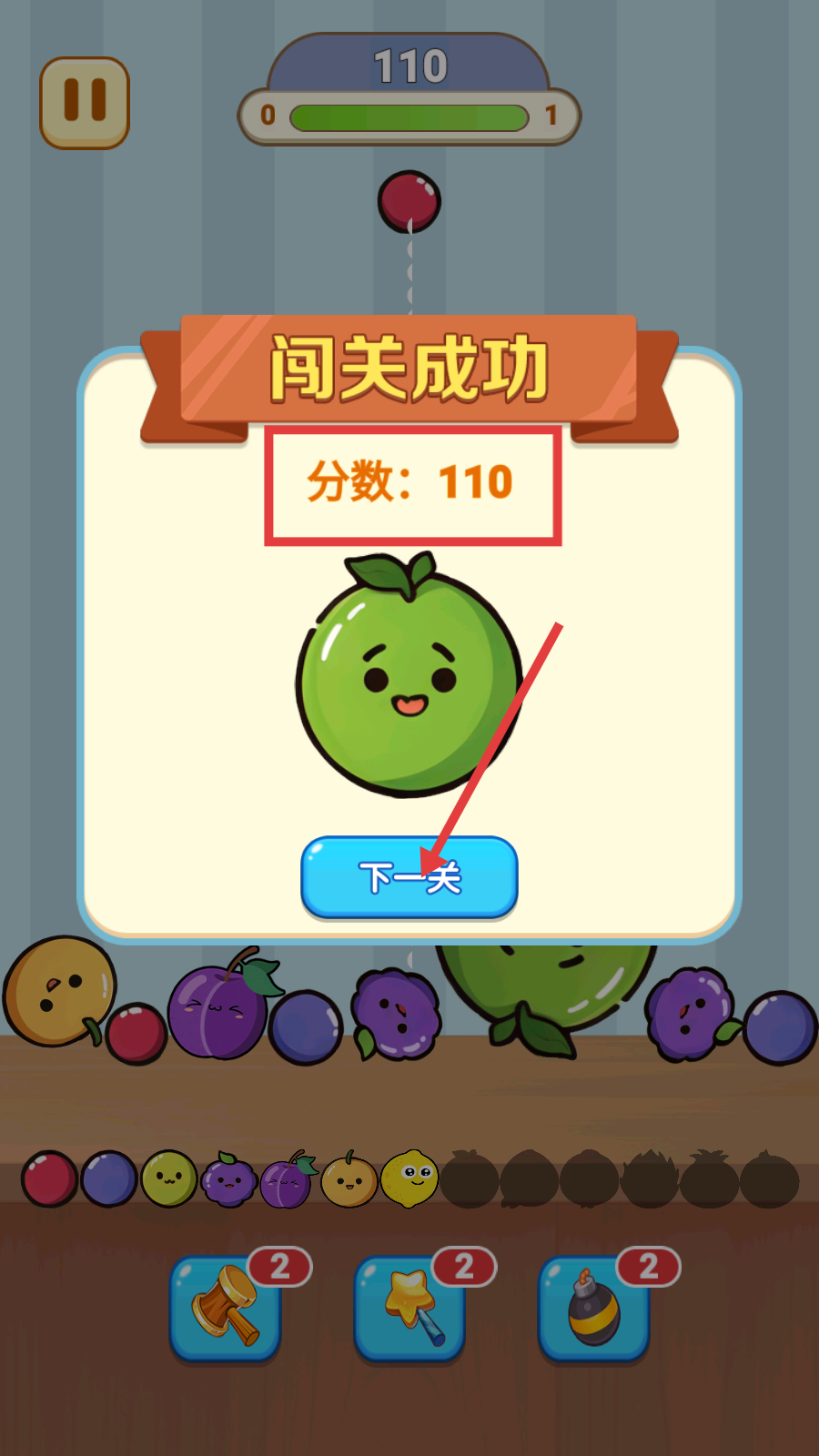 4、闯关成功后,点击【下一关】按钮,继续挑战获取更高分数,解锁更多水果角色。