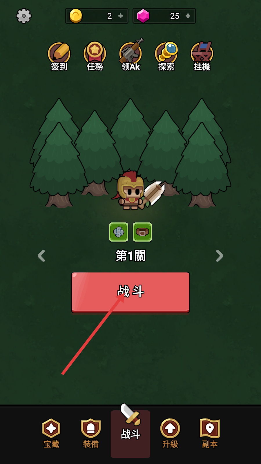 1、点击【战斗】按钮,进入【第1關】,开启游戏第一关的冒险,可先熟悉界面上的【簽到】【任務】等功能。