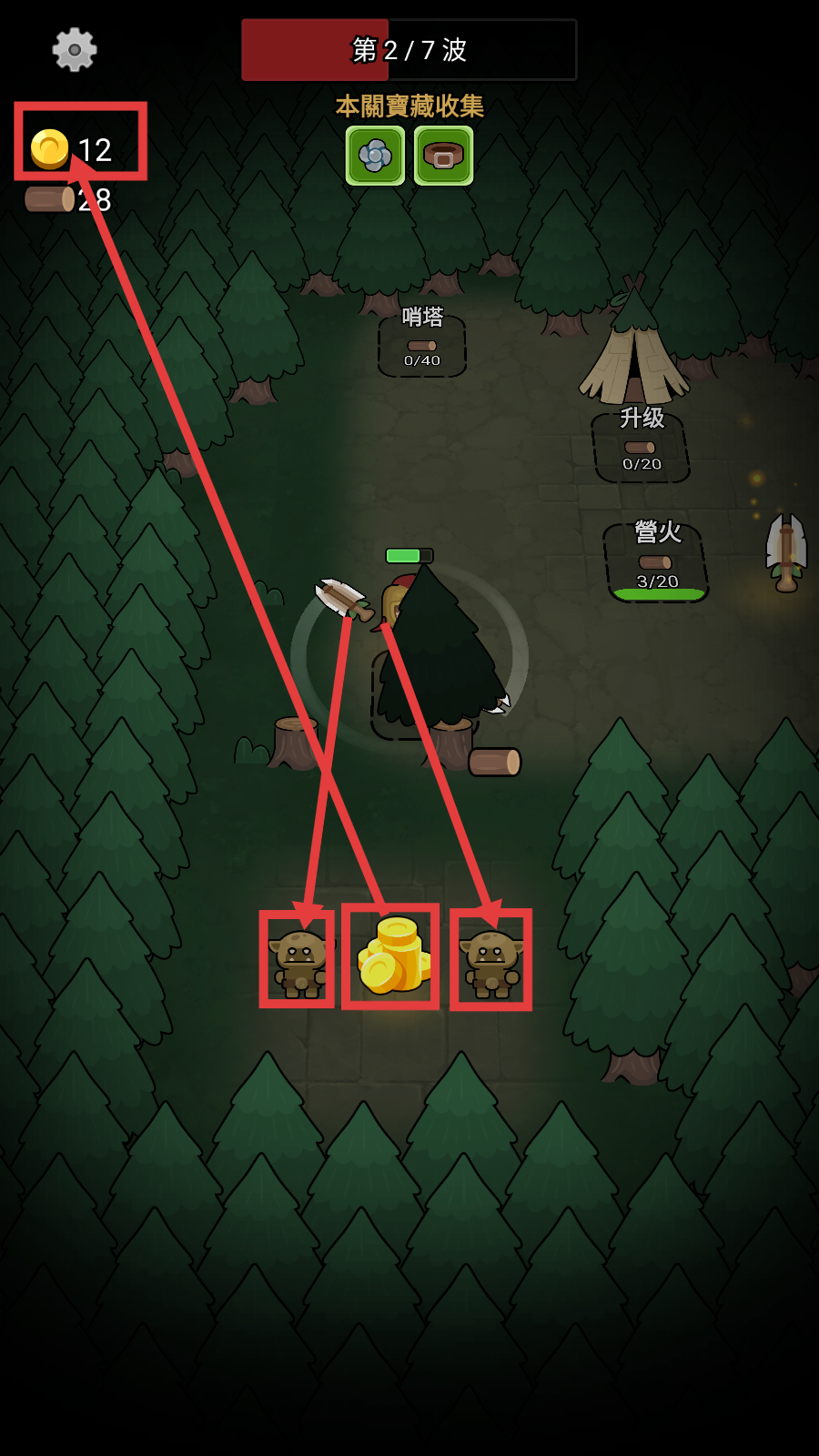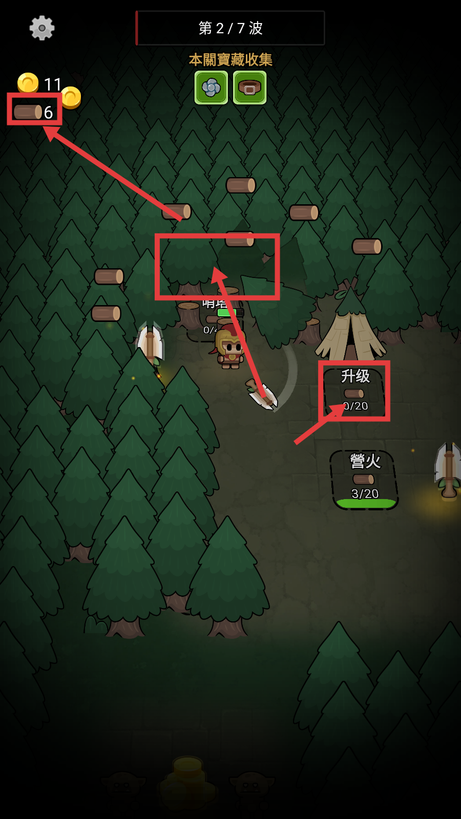 2、战斗时处于【第2/7波】,要收集【木材】,木材可用于【升級-0/20】和【營火-3/20】的进度积累,助力发展。