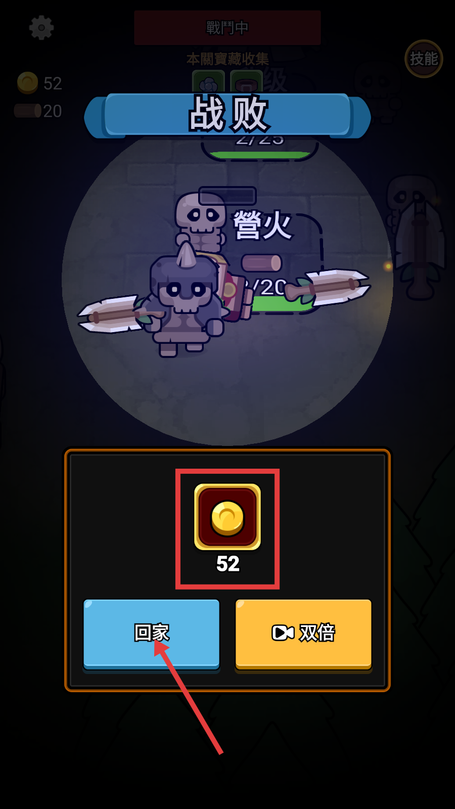 4、若战斗战败,界面会显示获得的金币,如【52】,可点击【回家】返回,也能选择【双倍】看视频来双倍获取金币。