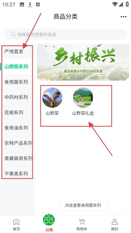 2、商品分类页有【山野菜系列】等分类,选【山野菜系列】,能看到【山野菜】【山野菜礼盒】等选项,按需选择。