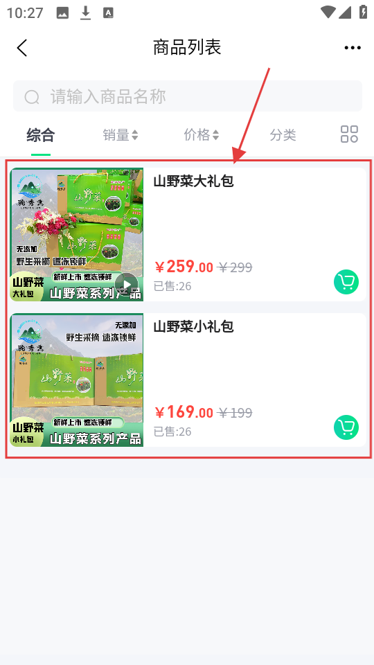 3、商品列表页有【山野菜大礼包】【山野菜小礼包】等商品,看中喜欢的,点进去就能查看详情。
