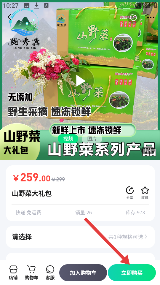 4、山野菜大礼包详情页,能看到价格、销量等信息。想购买的话,点【立即购买】按钮,就能成功下单啦。
