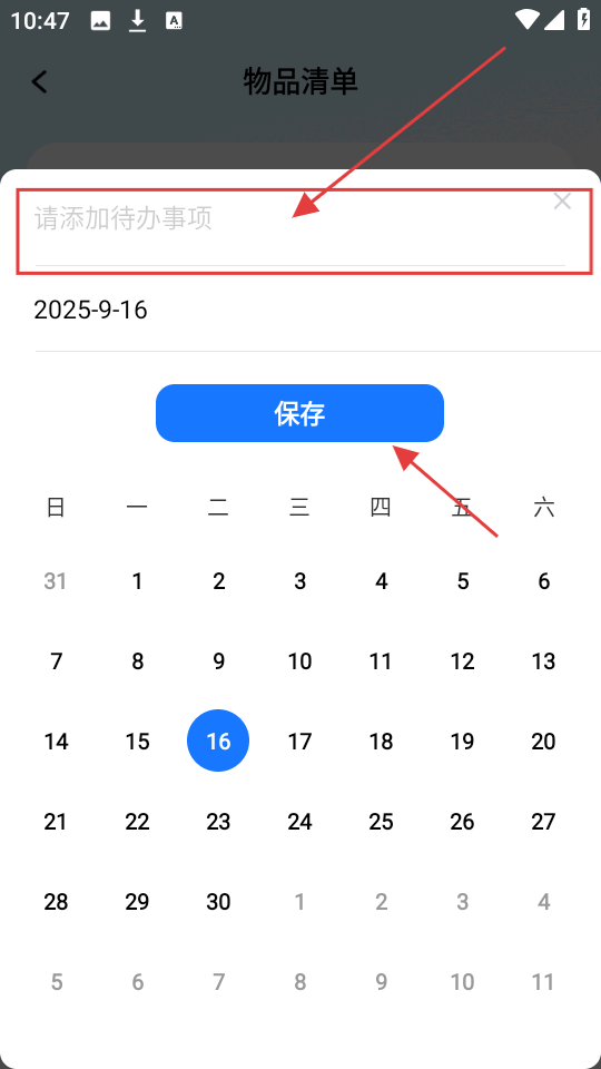 3、添加物品时,输入待办事项,选好日期,点一下【保存】按钮,物品信息就能成功保存啦。