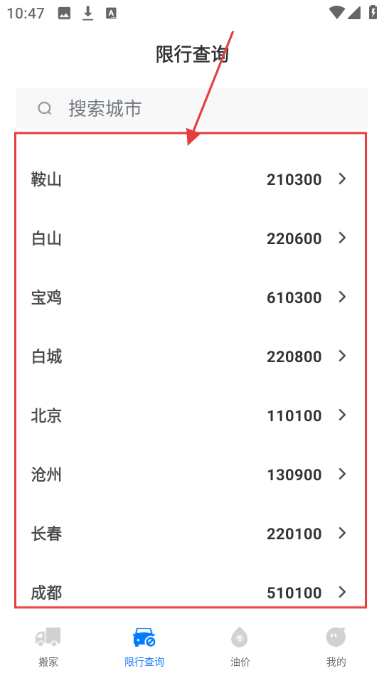 4、限行查询页面罗列着鞍山、白山等好多城市,选好想要查询的城市,就能查看当地限行情况喽。