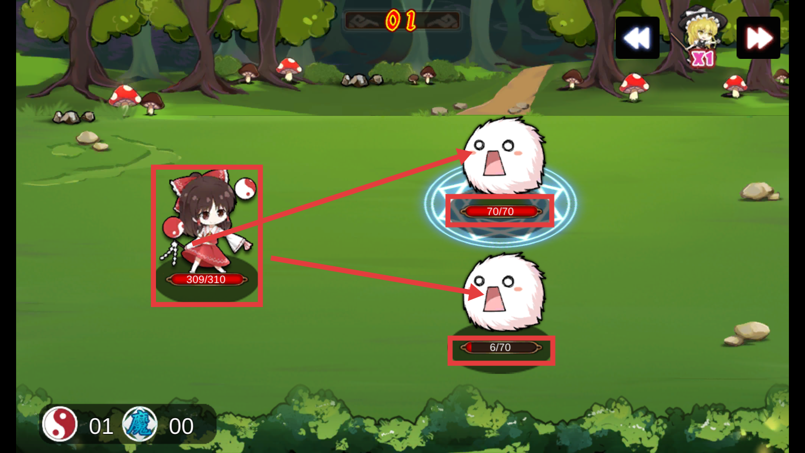 3、战斗时操控角色,攻击气血分别为【70/70】和【6/70】的毛玉,利用角色战力逐步击败敌人。