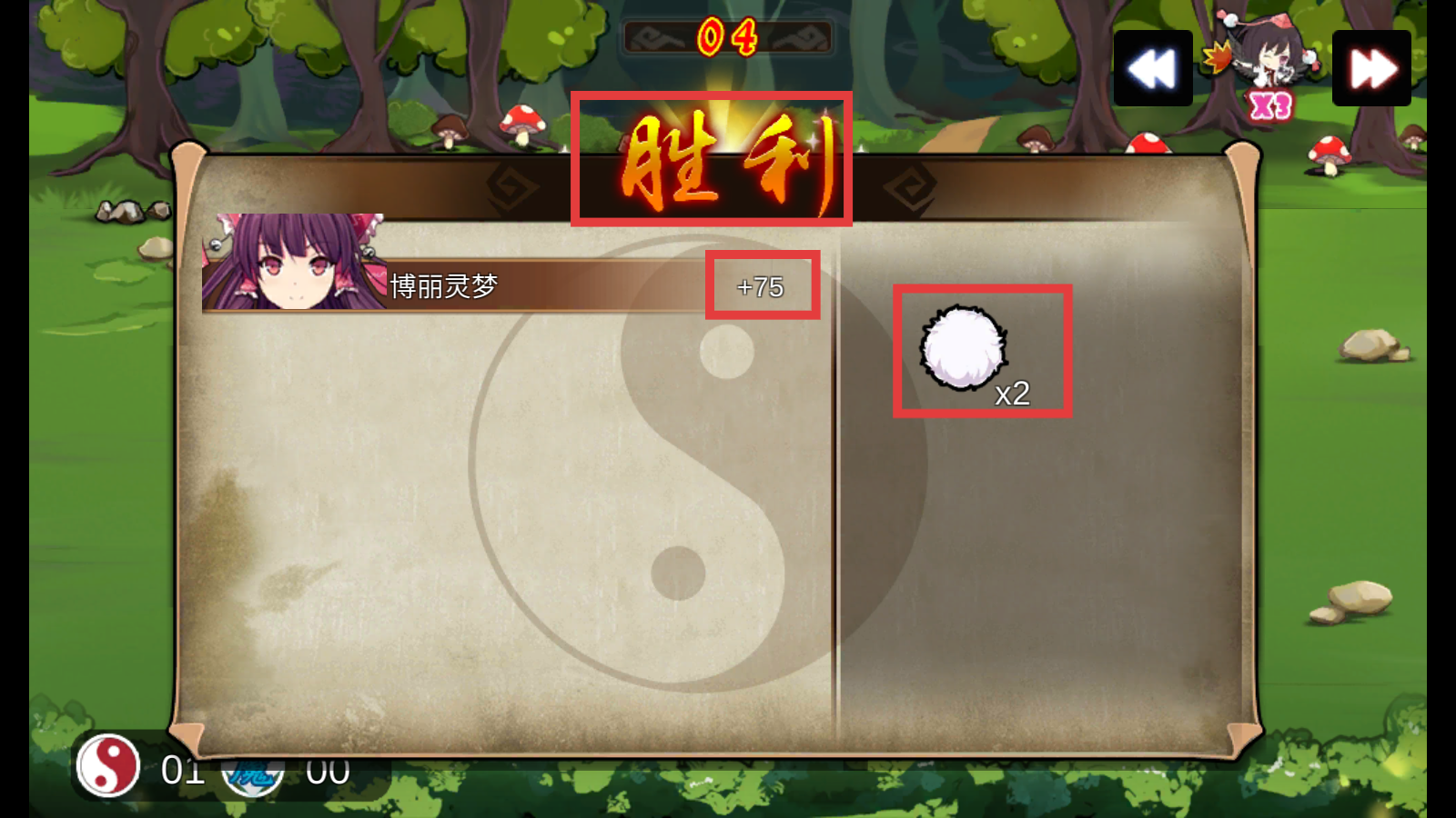 4、胜利后,角色“博丽灵梦”获得【+75】经验,还能得到【毛玉×2】的战利品,积累资源提升实力。