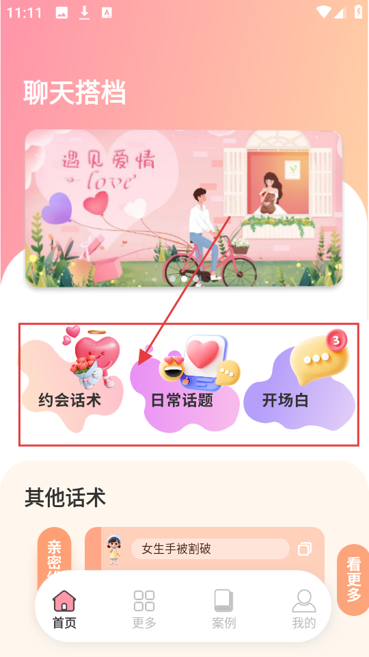 1、想提升聊天技能,首页有【约会话术】【日常话题】等板块,点进去能找到超多实用聊天内容。