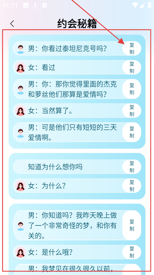 2、进入【约会秘籍】,里面有不少精彩对话案例,还能复制话术,聊天时用起来超方便。