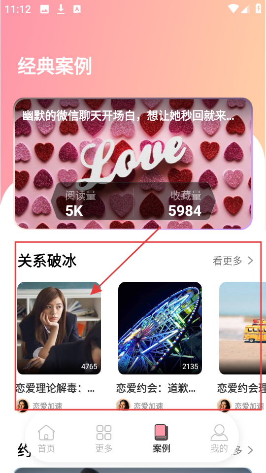 3、在案例板块,有【经典案例】【关系破冰】等内容,点相关案例,能学习很多恋爱聊天技巧。
