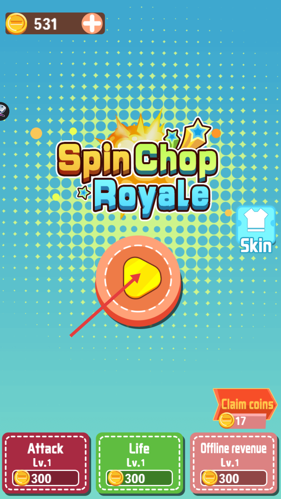 1、进入【SpinChopRoyale】,点击黄色启动按钮开始游戏,可先用金币升级【Attack】【Life】【Offlinerevenue】,提升基础能力。