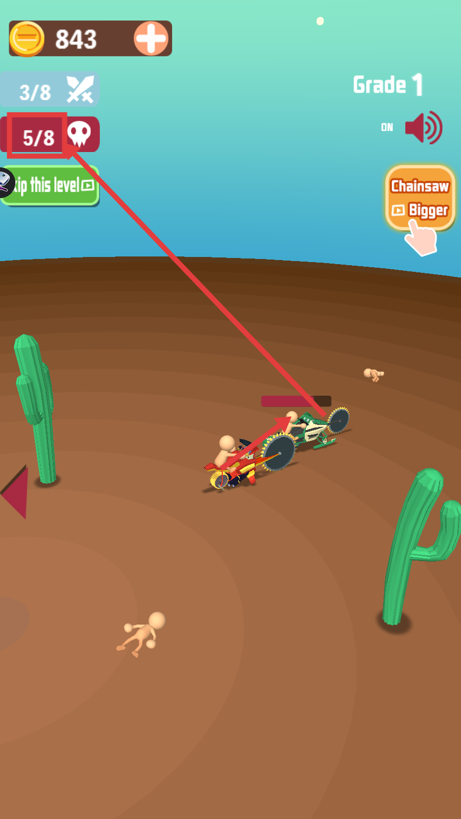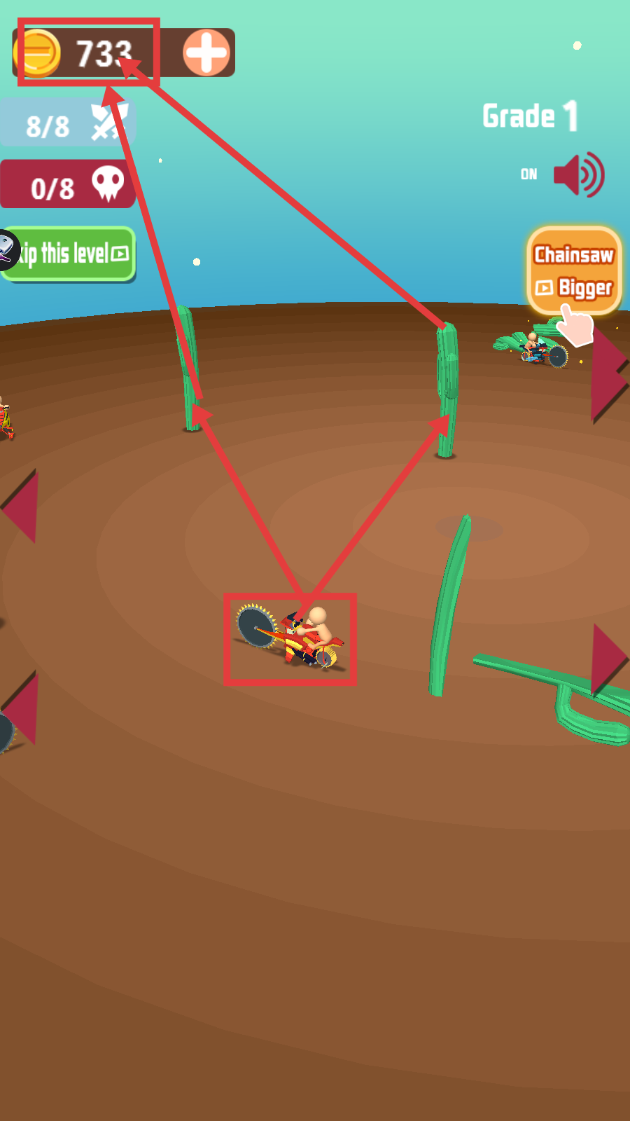 2、挑战中操控带锯子的载具,在沙漠场景里砍仙人掌,同时收集金币,让金币数量不断增长,积累资源。