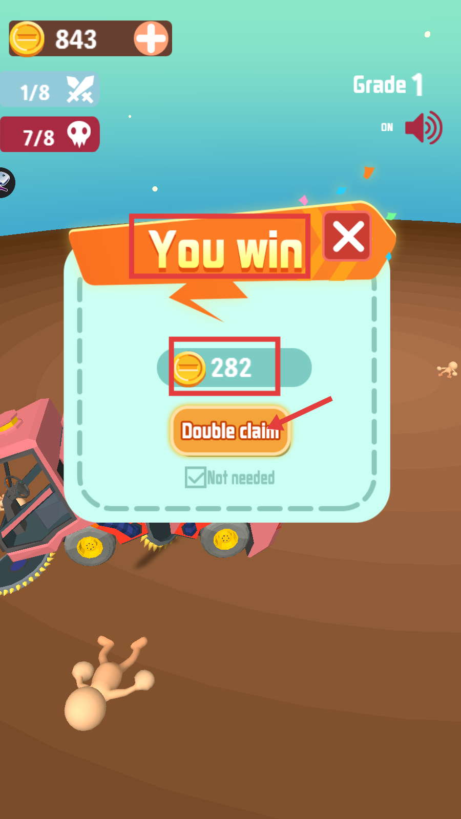 4、胜利后会弹出【Youwin】界面,获得金币奖励,可点击【Doubleclaim】领取双倍金币,快速积累更多资源用于后续升级。