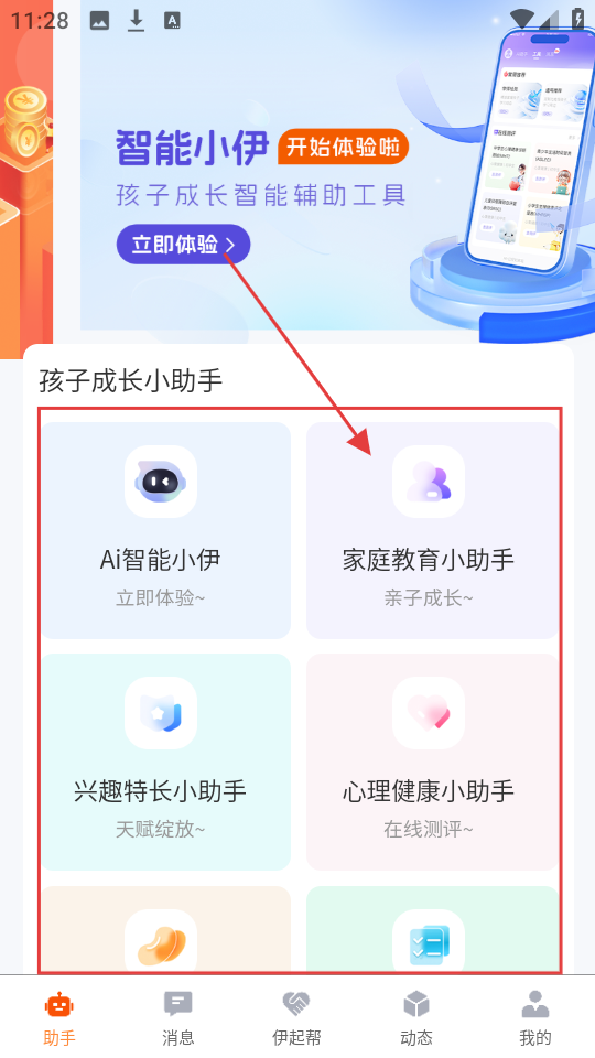 1、助手页面有【AI智能小伊】【家庭教育小助手】等功能,这些功能能在孩子成长各方面提供帮助,超实用。