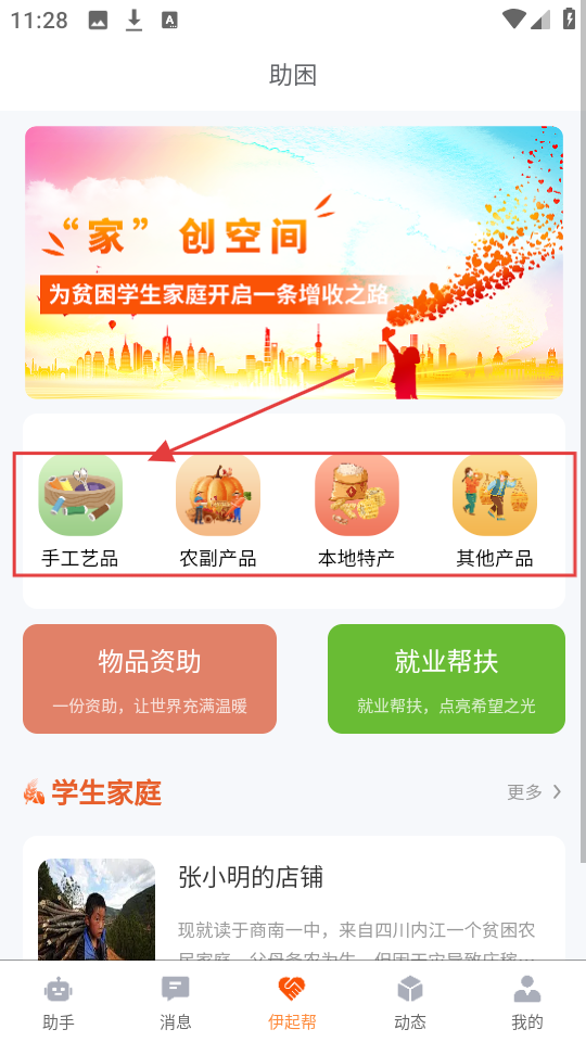 2、伊起帮页面有“家”创空间,还有【手工艺品】【农副产品】等分类,想助困的话,可从这些分类选产品。