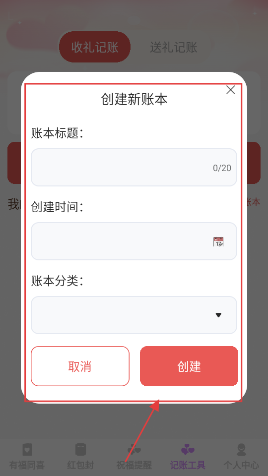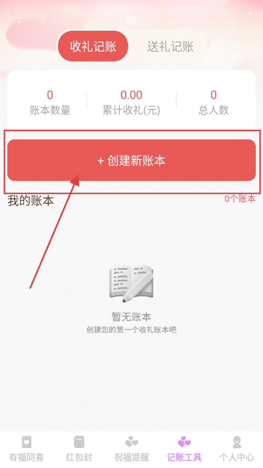 3、在记账工具页面,点【+创建新账本】,就能进入创建界面,开始记录收礼情况啦。