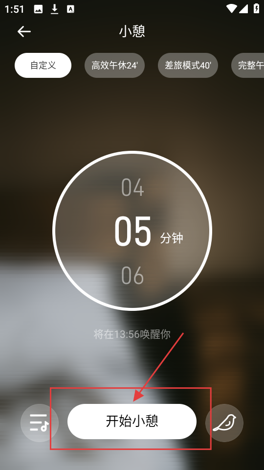 2、进入小憩页面,能选时长,选好后点【开始小憩】,就可以开始休息啦。