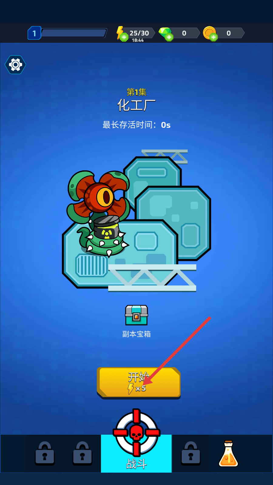 1、进入游戏后,选择【第1集-化工厂】关卡,点击【开始-体力值x5】按钮,即可开启该关卡挑战。