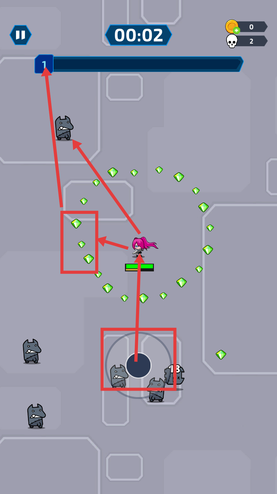 2、战斗时,操控角色移动,收集【绿宝石】,同时攻击周围的灰色小怪,推进关卡进程。