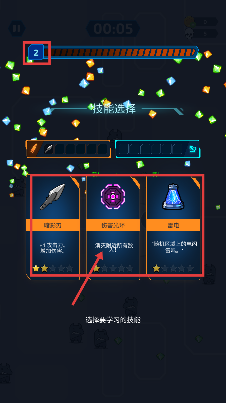 3、升级时会出现【技能选择】界面,可从【暗影刃】【伤害光环】【雷电】中选适合的技能,增强战斗能力。
