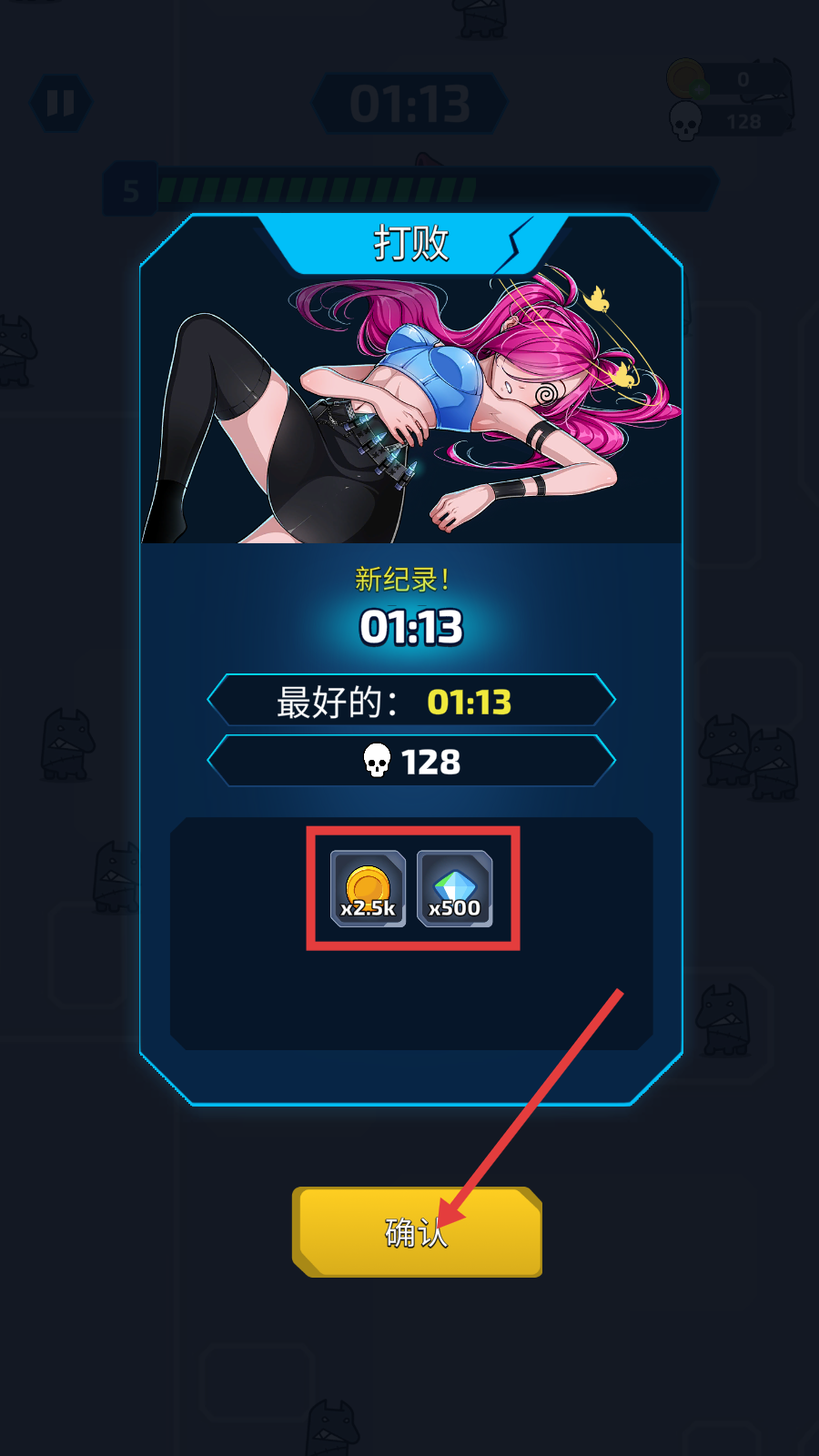 4、成功通关后,界面显示新纪录与奖励【金币-x2.5k】【钻石-x500】,点击【确认】按钮即可领取奖励。