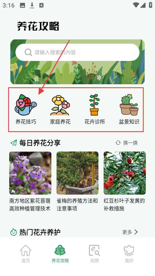 2、养花攻略页面有养花技巧、家庭养花等分类,选【养花技巧】,能学好多养花知识。