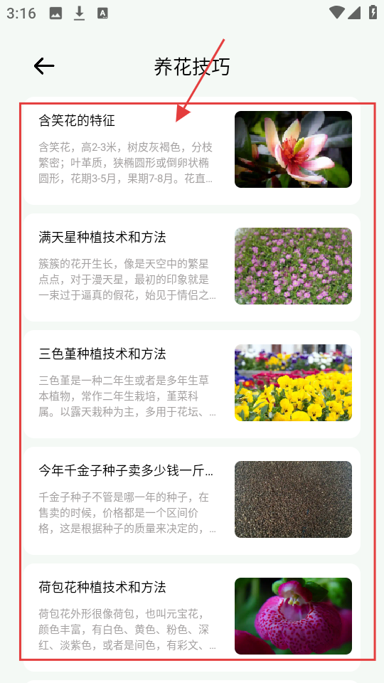 2、养花技巧查询:按花卉品种、生长阶段或养护问题检索攻略,提供针对性解决方案,包括季节性养护要点与常见问题处理。
