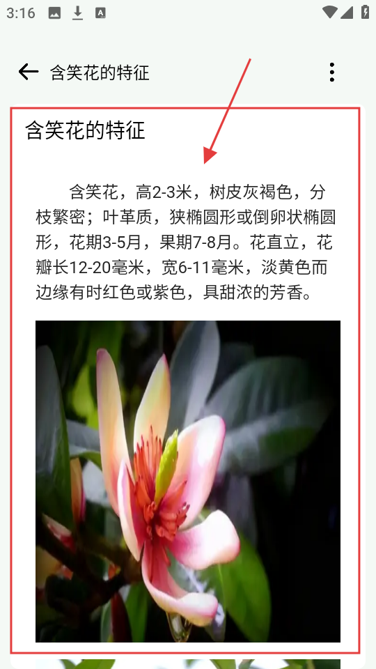4、进入含笑花的特征页面,能看到它的高度、树皮、花期等详细信息,还有好看的图片。