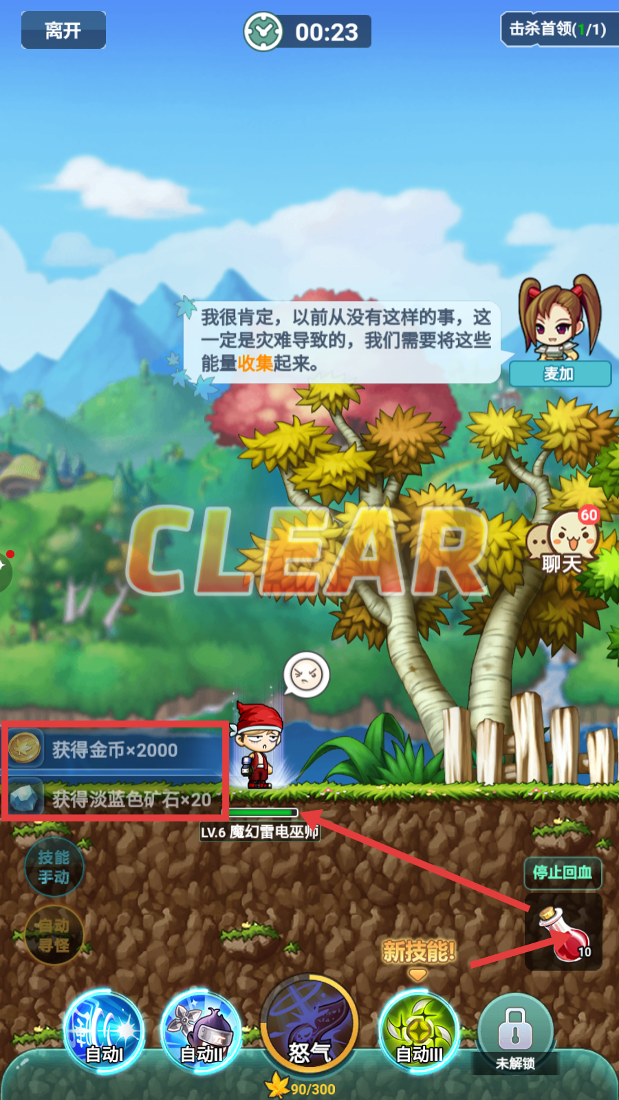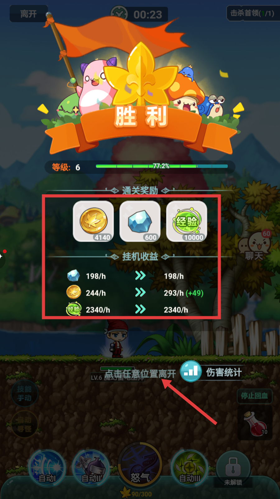 4、通关关卡后,除了获得【金币-4140】【钻石-600】【经验-10000】的奖励,挂机收益也会得到提升,加快角色成长速度。