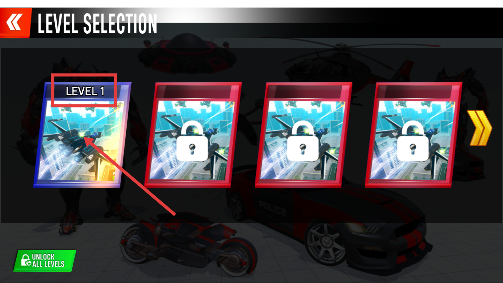 1、进入游戏后,在【LEVEL-SELECTION】界面选择【LEVEL-1】,开启第一关的机甲战斗挑战。