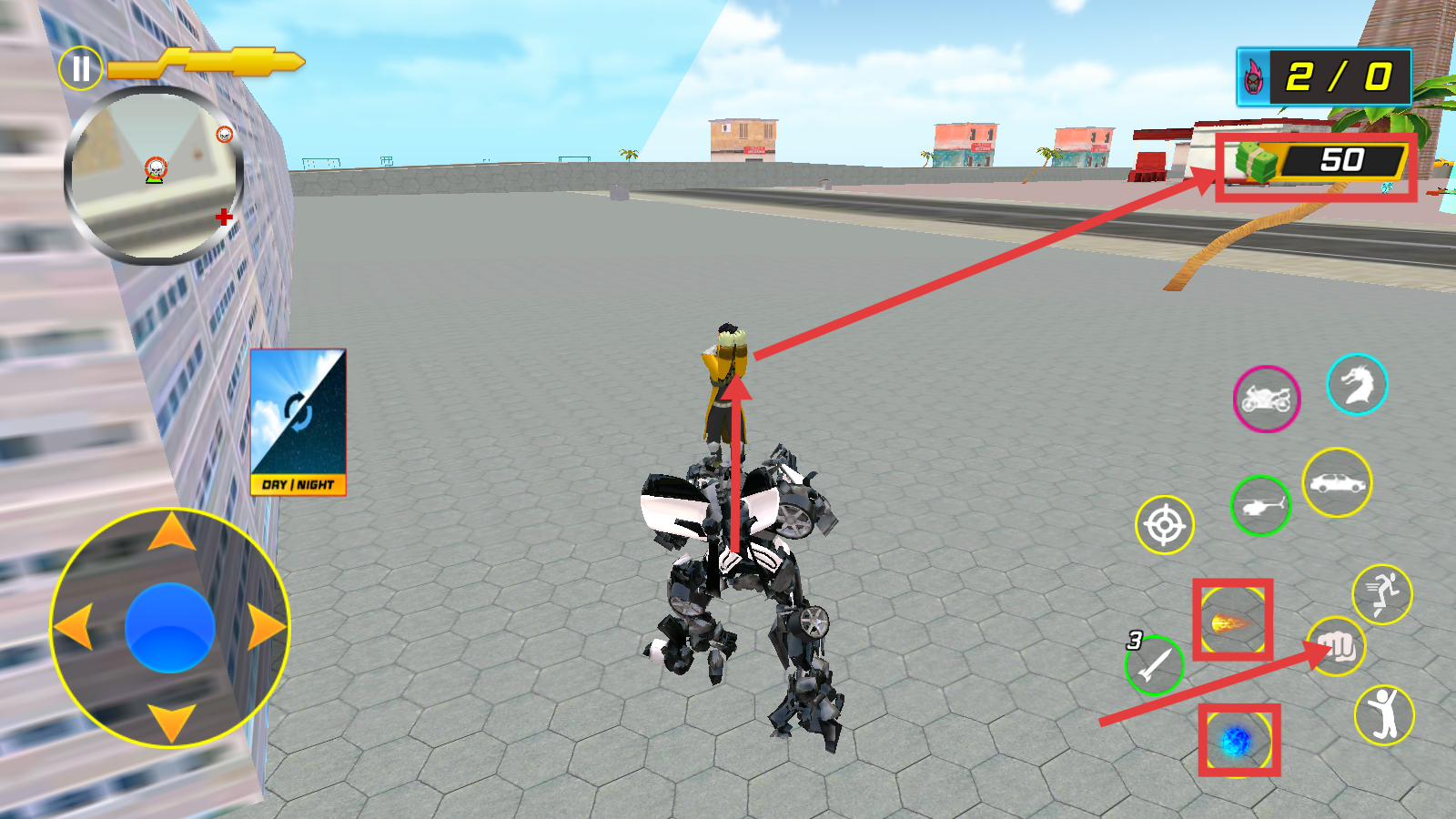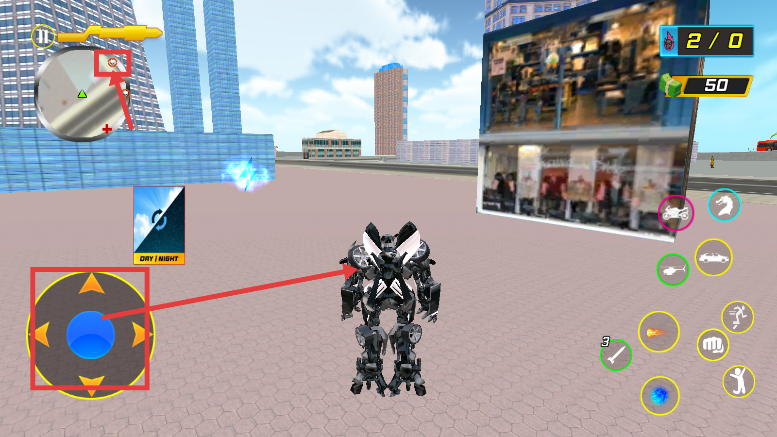 3、遇到敌人时,使用右侧的技能(如拳头、蓝色光球等)攻击,同时可获取【50】金钱等资源,增强机甲战力。