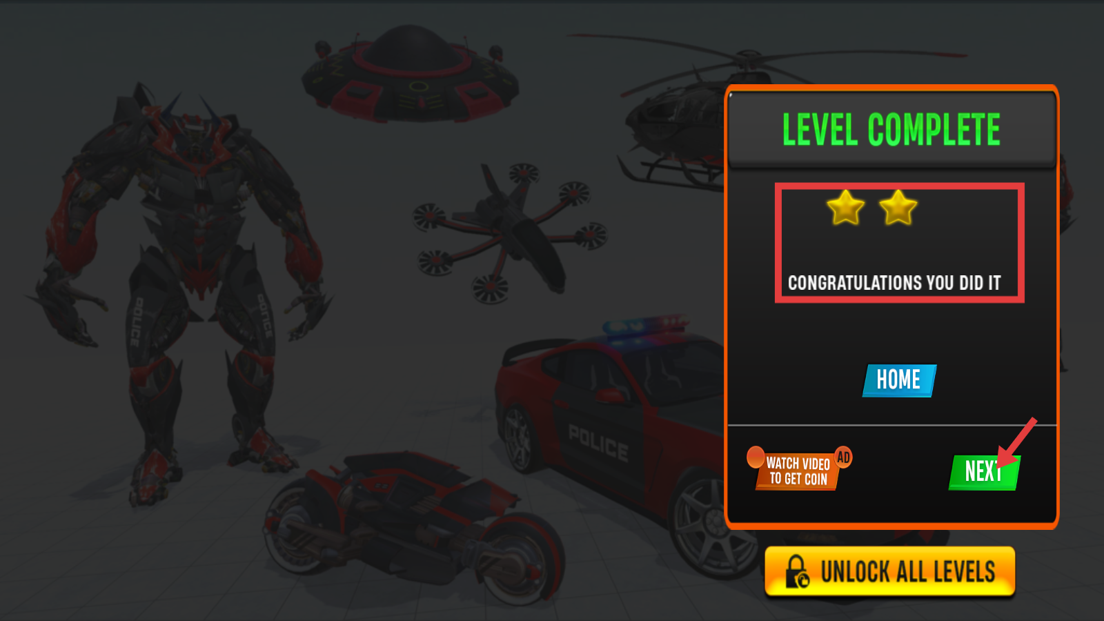 4、成功通关后,界面显示【LEVEL-COMPLETE】,获得两颗星评价,点击【NEXT】按钮,即可挑战下一个关卡。