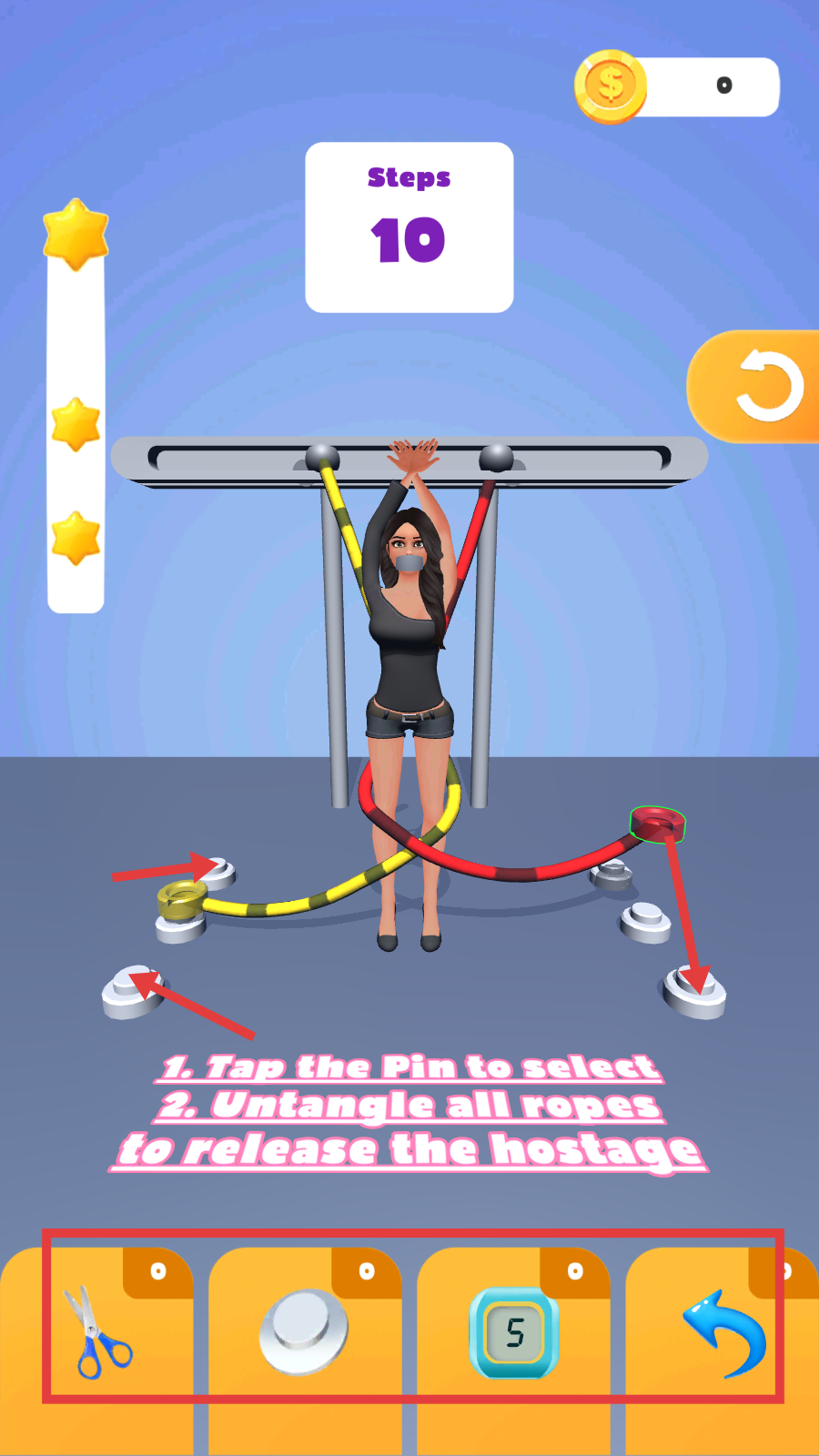 2、解谜时,可借助底部的【剪刀】【圆形道具】等工具,辅助选择pin,更高效地解开绳子,减少步骤数。