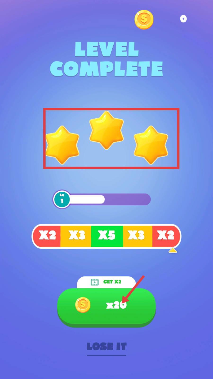 4、成功解开所有绳子,界面显示【LEVEL-COMPLETE】,获得三颗星评价,还能领取【金币-x20】的奖励,完成关卡挑战。