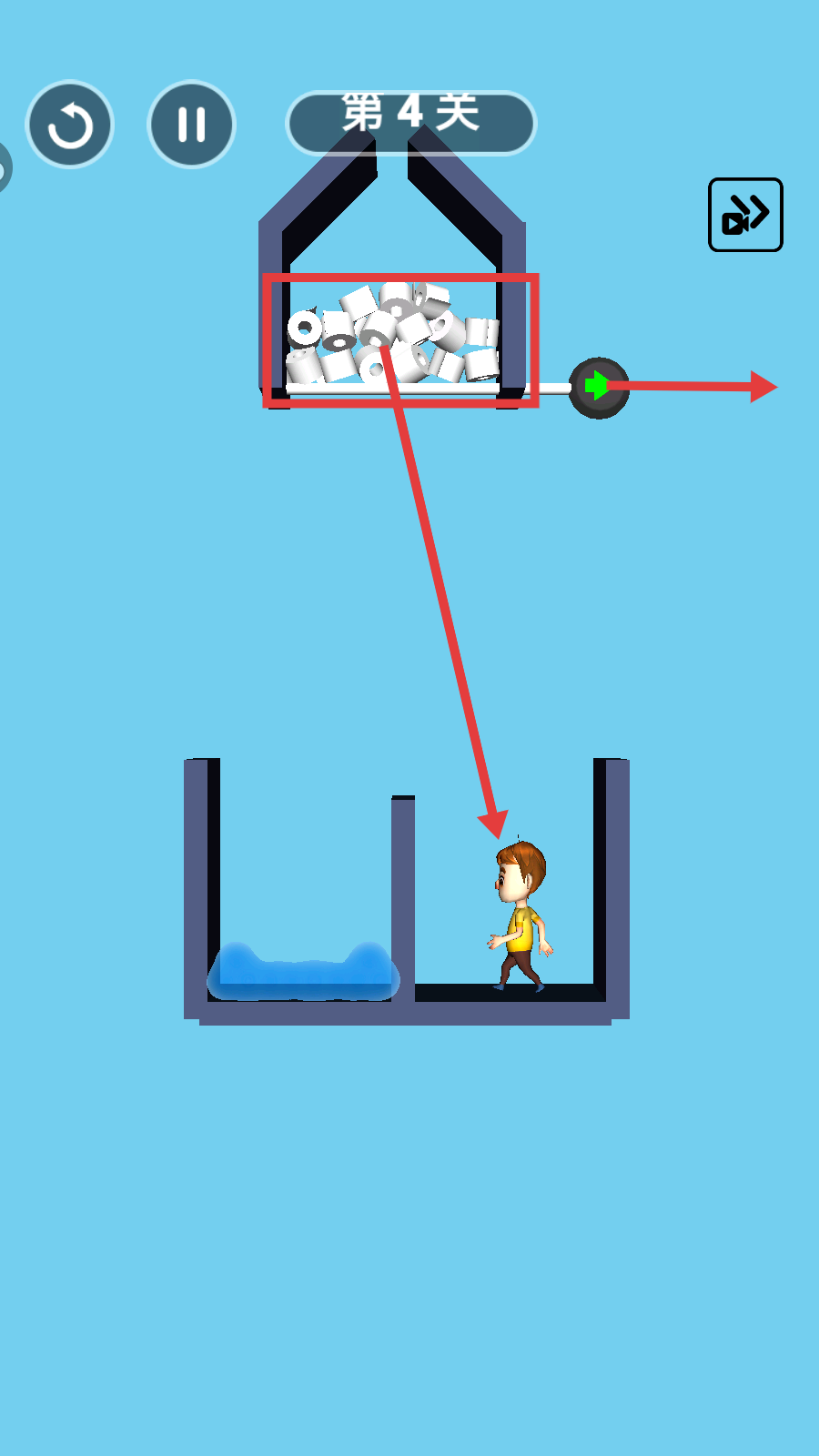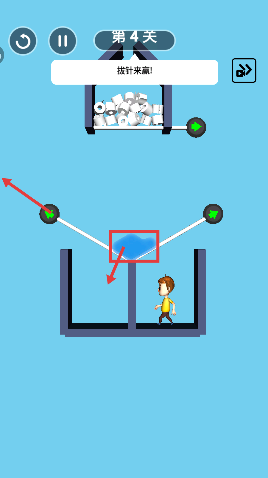 2、在第4关,根据“拔针来赢”的提示,观察蓝色液体与人物的位置,规划拔针顺序,避免液体伤害人物。