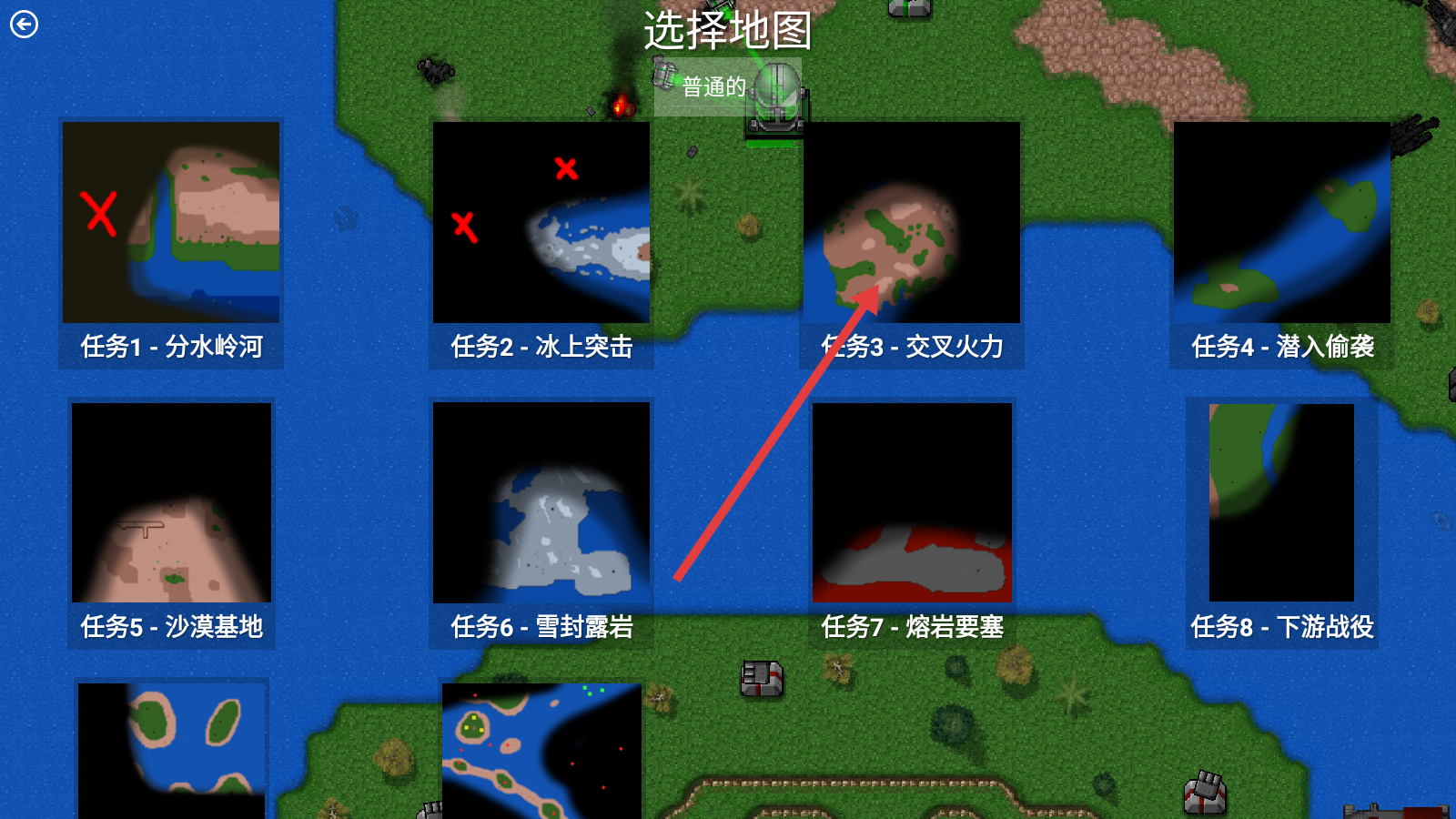 1、选择【任务3-交叉火力】地图开启游戏,该地图的地形布局适合新手初步熟悉攻防作战的节奏。