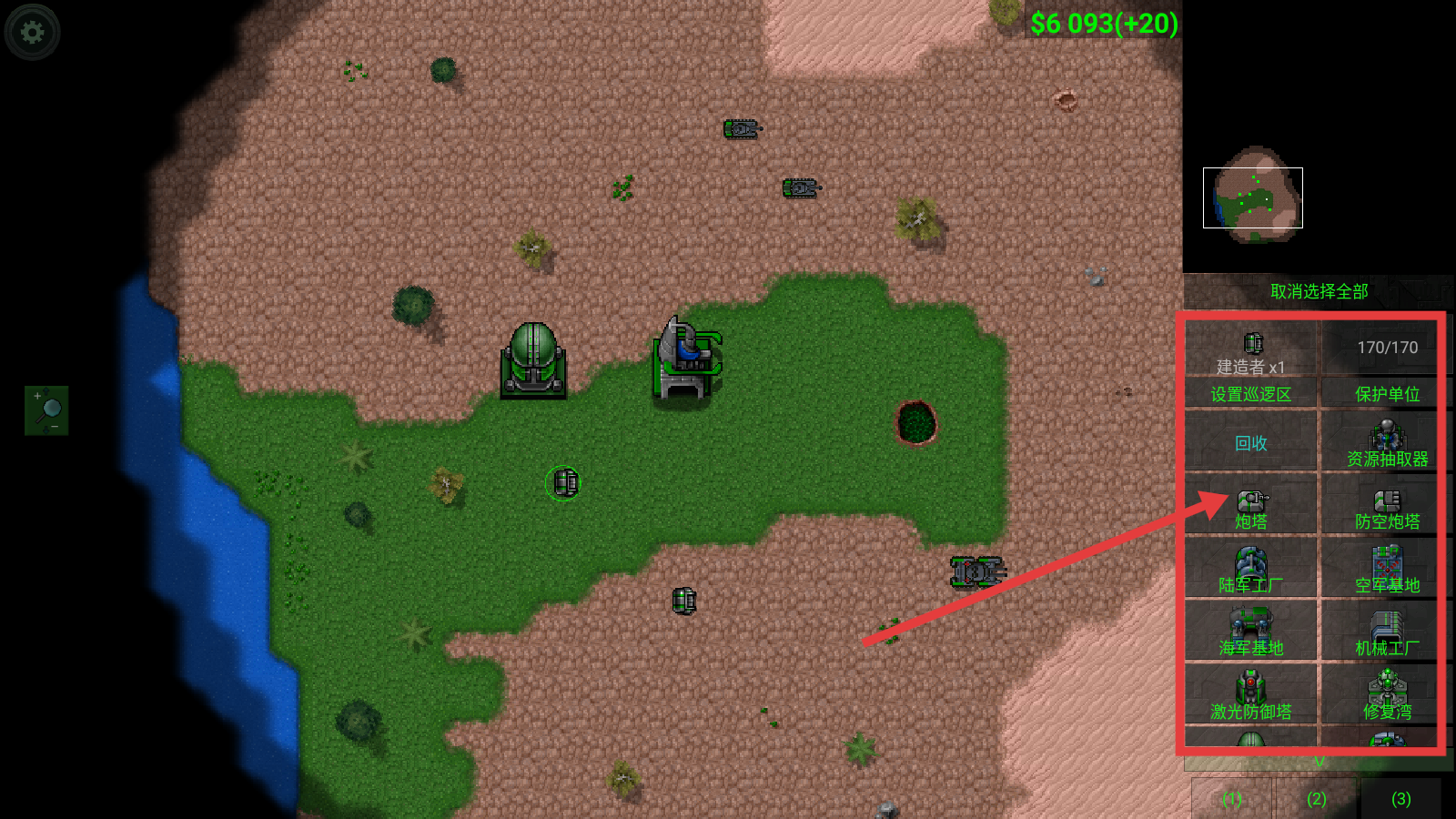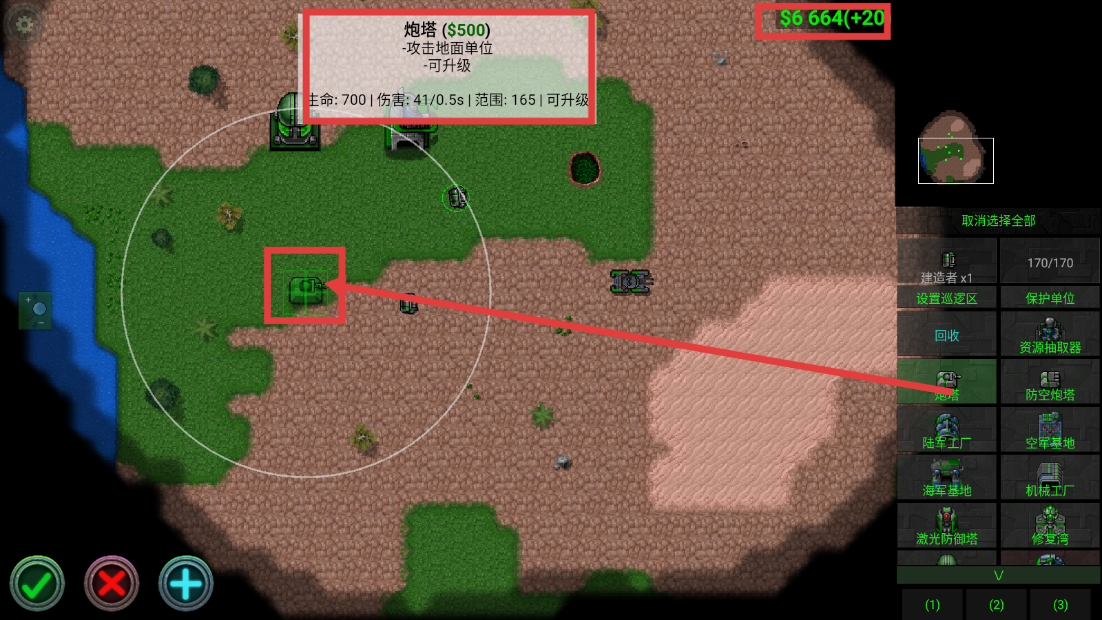 3、建造【炮塔($500)】时,留意其“攻击地面单位-可升级”的属性,挑选合适位置放置,让炮塔覆盖关键防御区域。