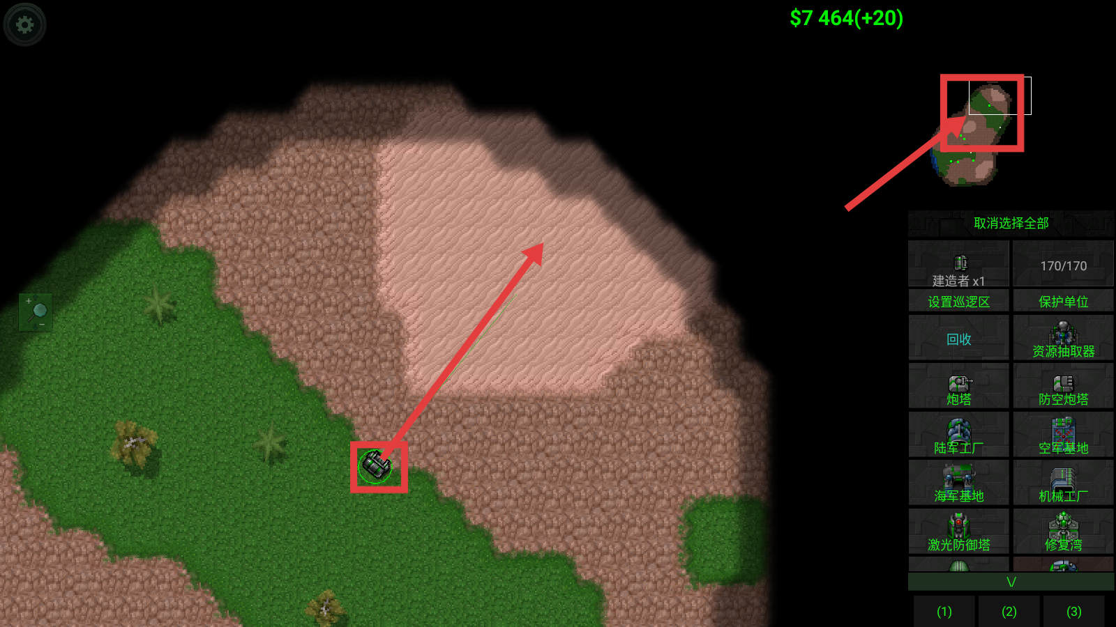 4、借助右上角小地图观察区域,指挥单位向未探索的沙地区域移动,拓展视野的同时为后续建筑布局做准备。