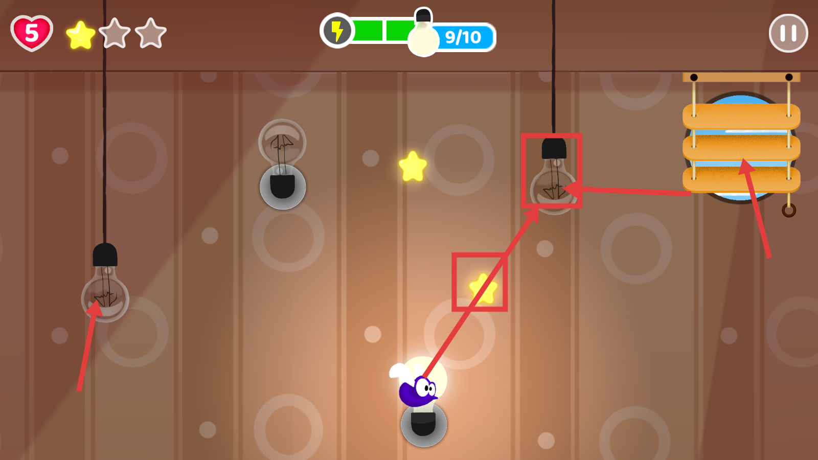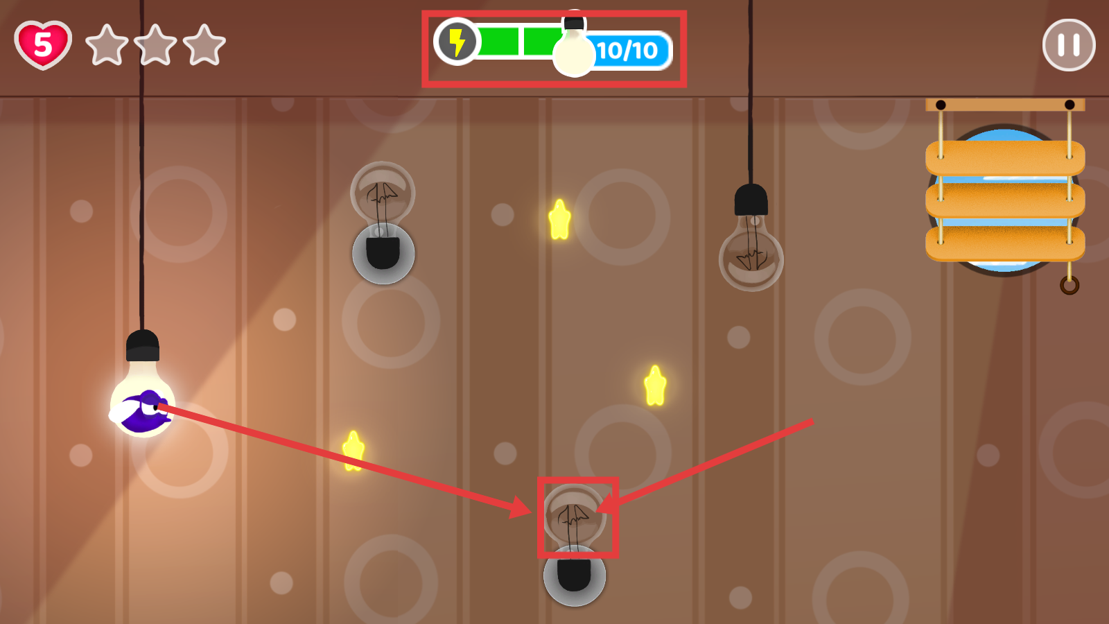 2、挑战过程中关注上方能量条,操控蚊子飞向【灯泡】,同时收集黄色星星,推进关卡进度。