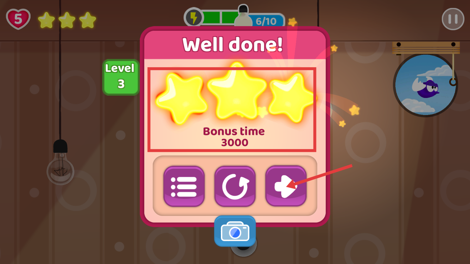 4、通关后若出现【Well-done!】界面且获得三星评价,点击紫色箭头按钮,即可进入下一关继续挑战。
