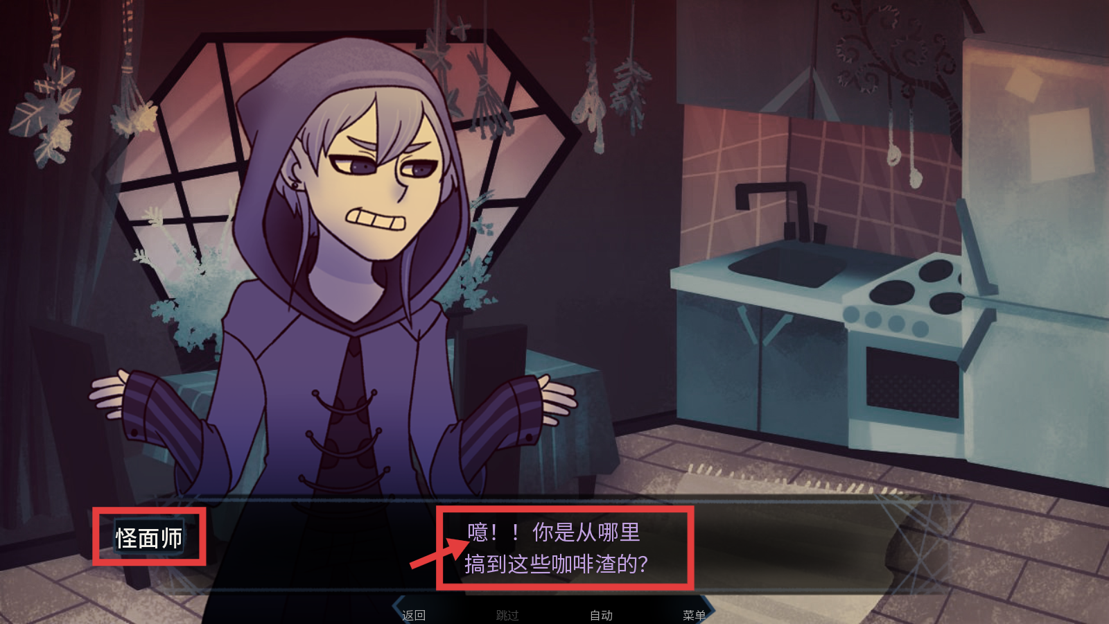 2、遇到角色【怪面师】时,留意其“噫!!你是从哪里搞到这些咖啡渣的?”的对话,依据对话进行剧情交互。