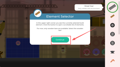 4、学习元素选择器。点击“Continue”了解如何建造和选择材料。