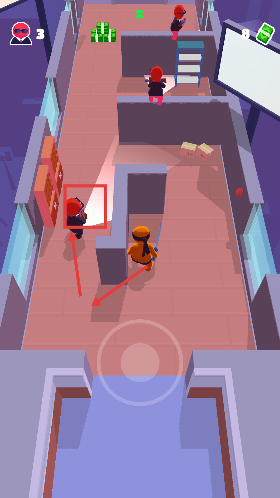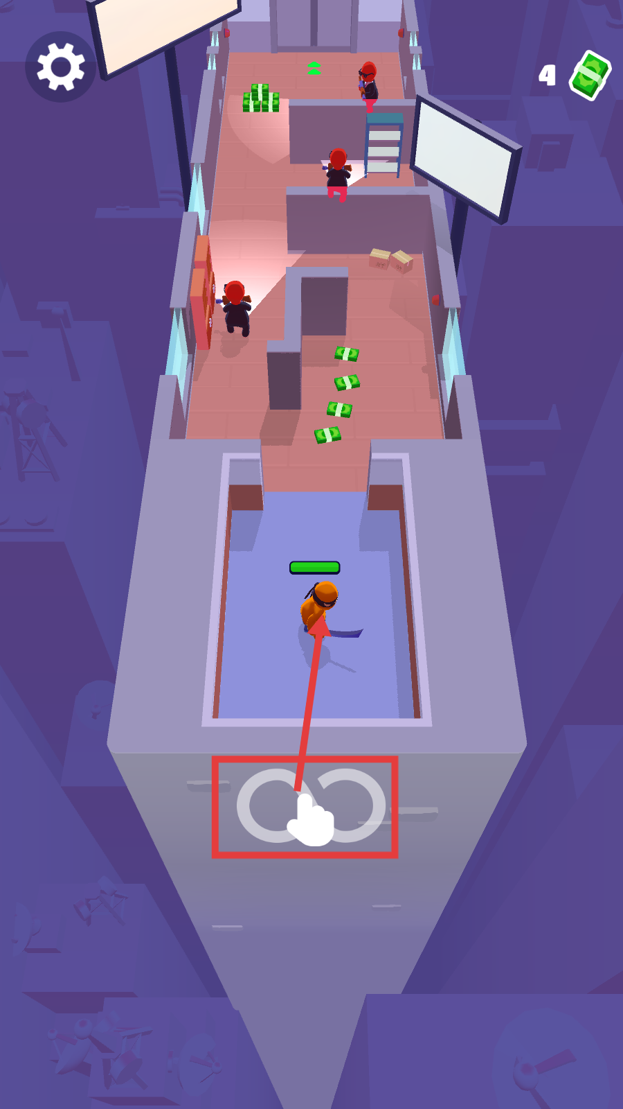 1、点击场景下方的环形区域,操控角色进入关卡,留意场景中的敌人与散落的钞票。