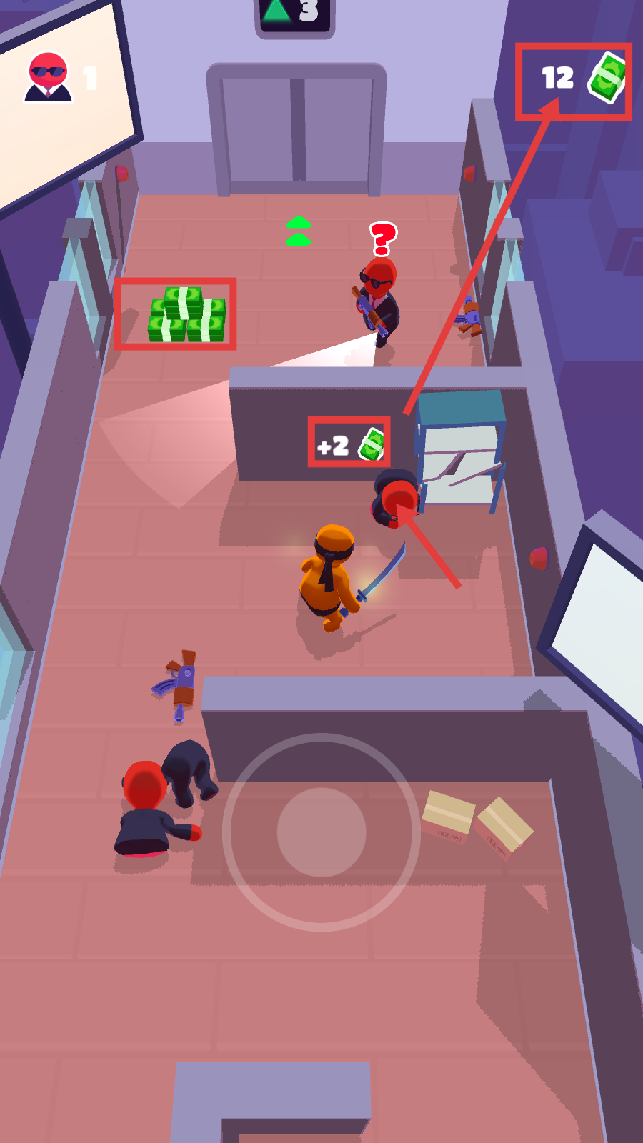3、击败敌人可获取【+2-钞票】,同时收集场景里的成堆钞票,让右上角的钞票总数不断提升。