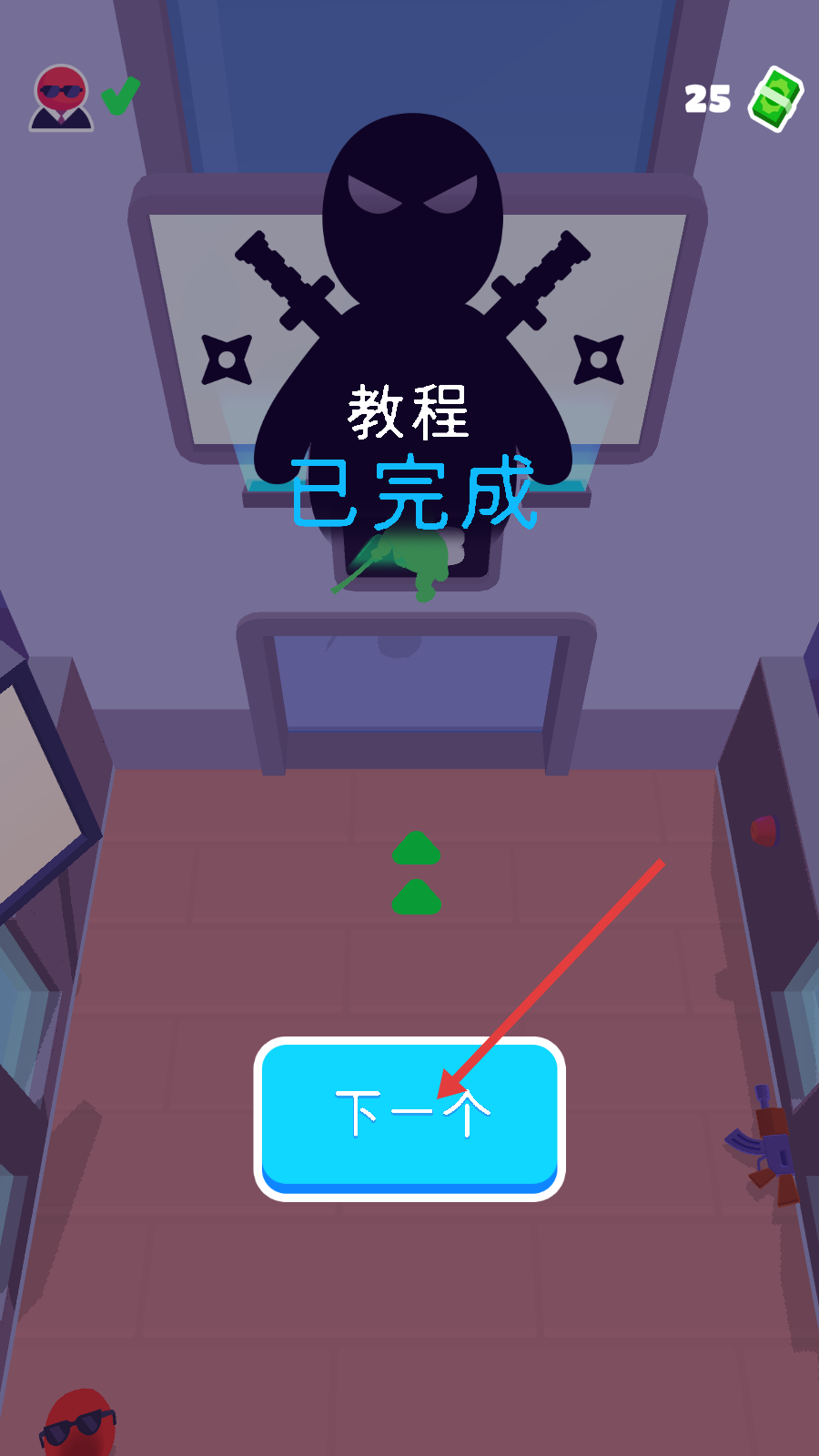 4、当界面显示【教程-已完成】时,点击【下一个】按钮,即可进入后续关卡继续挑战。