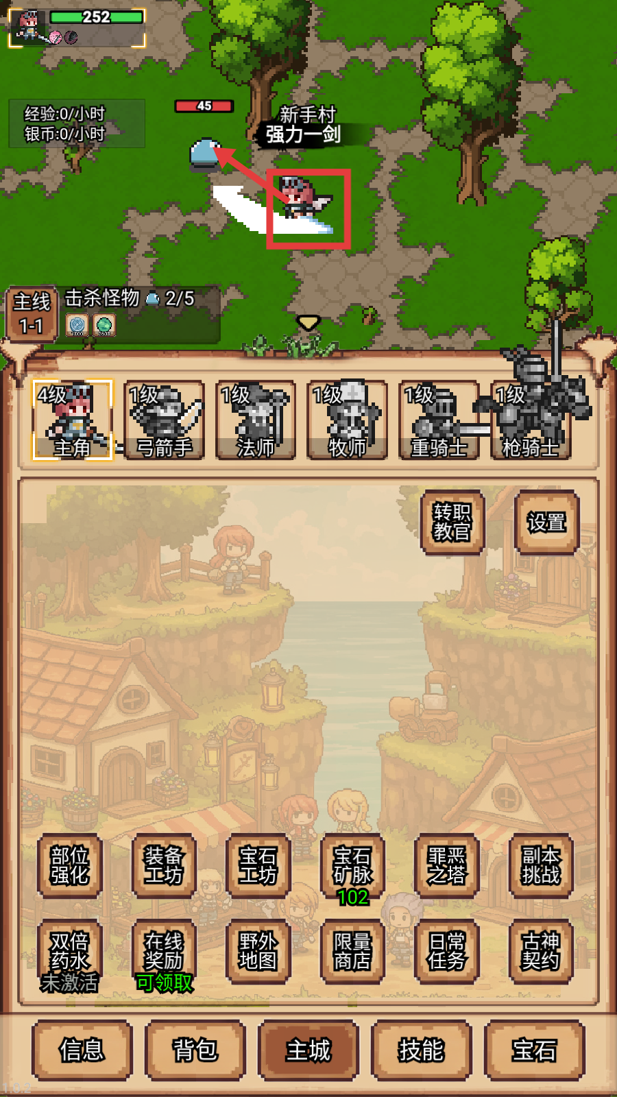 1、在新手村操控主角释放【强力一剑】攻击怪物,推进主线1-1“击杀怪物2/5”的任务,同时熟悉角色与职业界面。