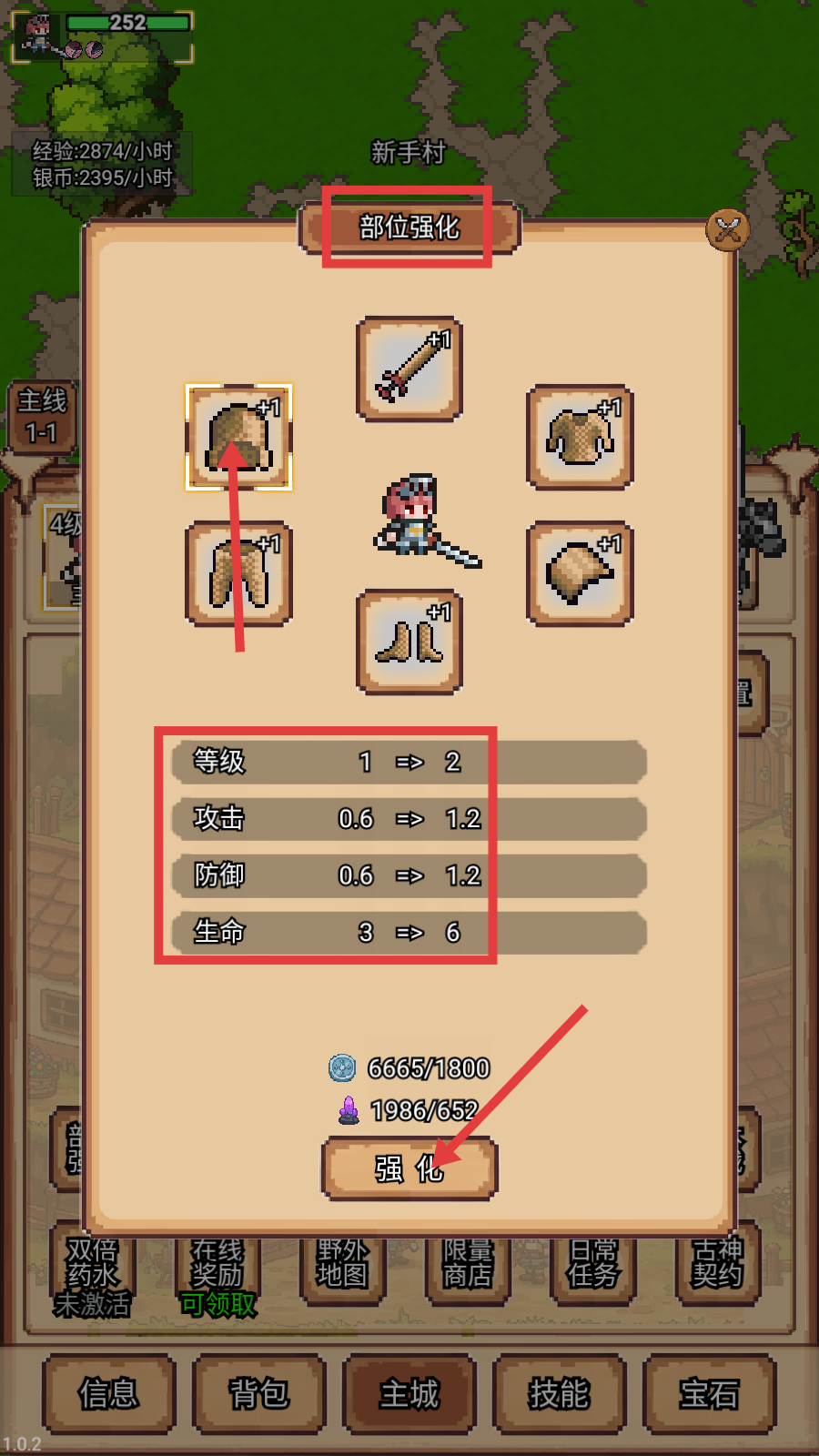 2、进入【部位强化】界面,选择装备部位(如头盔),消耗资源点击【强化】,提升等级、攻击、防御、生命属性以增强战力。