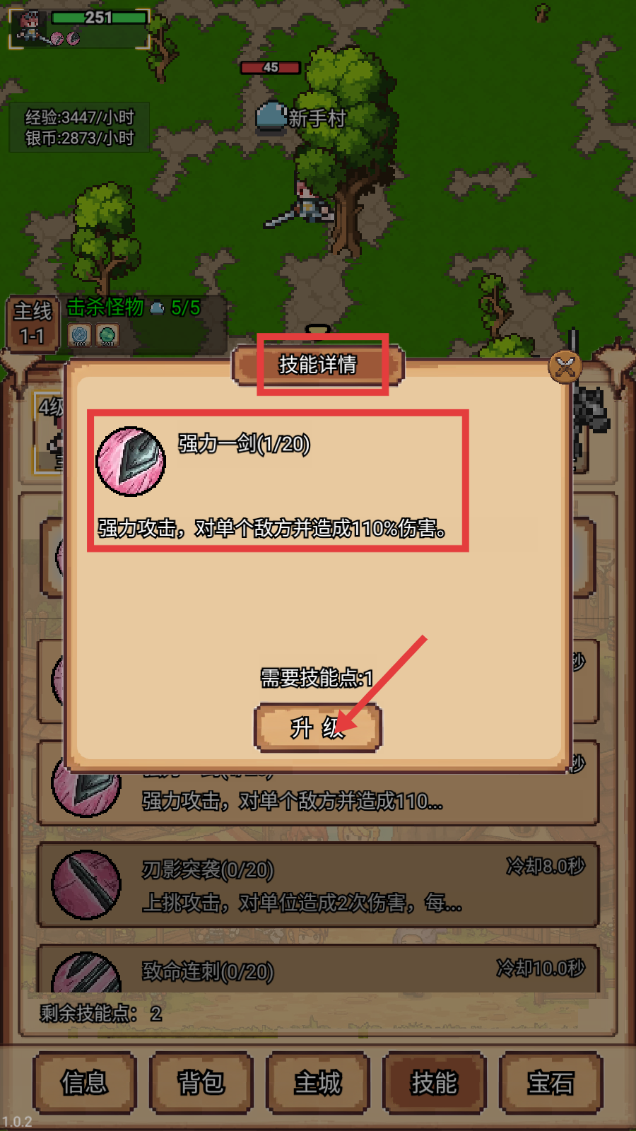 3、查看【技能详情】,对【强力一剑(1/20)】技能,消耗1技能点点击【升级】,提升其对单个敌方造成的伤害效果。