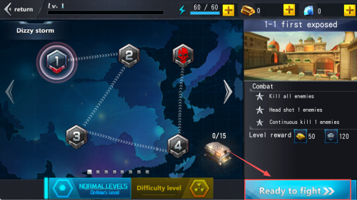 3、如何进入关卡?点击“1-1 first exposed”关卡,查看难度后按“Ready to fight”开始。