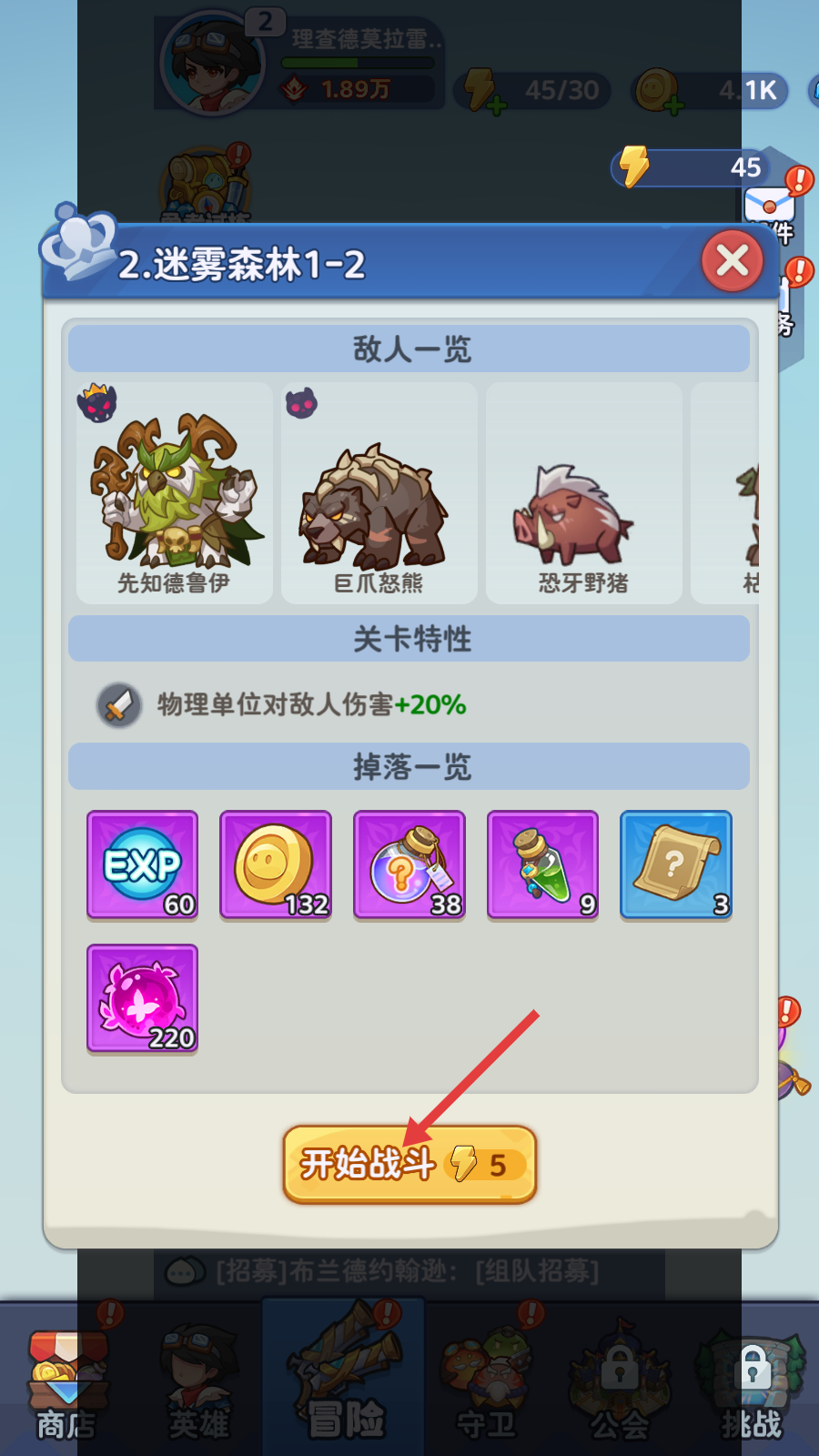 1、挑战【迷雾森林1-2】前,看清敌人有【先知德鲁伊】【巨爪怒熊】,利用物理单位伤害+20%的特性,准备好后点【开始战斗】。